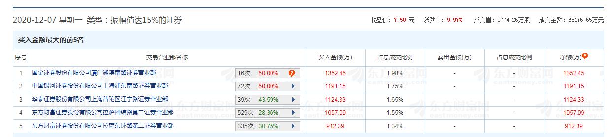 华资实业昨日龙虎榜单同样由营业部包揽所有席位,国金证券厦门湖滨南路营业部以1352.45万元居买一席位,华鑫证券深圳益田路营业部则以1322.65万元居卖一席位。