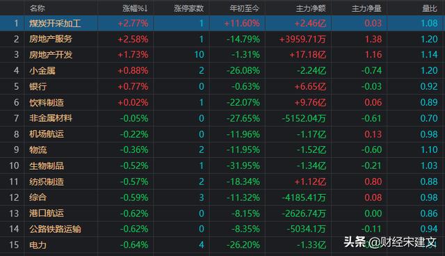 两市上涨个股1211家,下跌个股3402家,仍有超过3400只股票下跌,不少股票在昨天大幅反弹后再次走弱,涨停个股90家,涨停数不少,市场赚钱效应不错,跌停数77家,部分个股的抛压仍较重。今天仅有6个行业板块实现上涨,板块表现不佳,煤炭、地产、银行等传统周期性行业成为主要做多力量,对指数收红贡献明显。