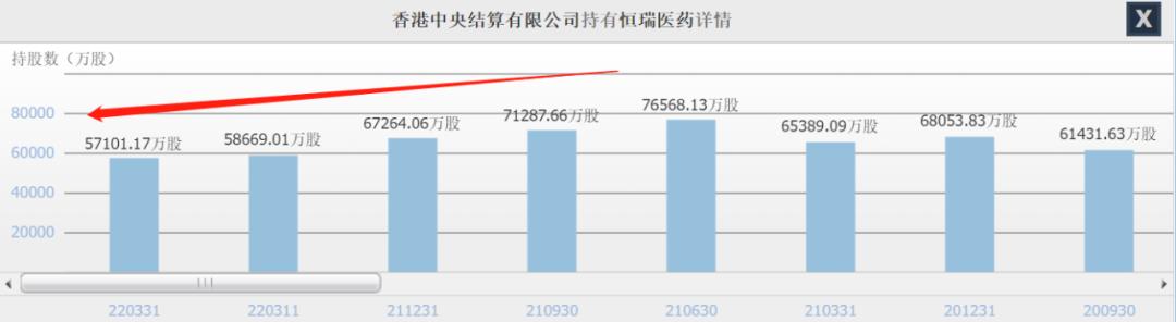 其次是外资的抛售。恒瑞医药十大股东情况显示,外资专户股东香港中央结算有限公司对公司的持股已经连续四个季度下降,从2021年半年报的7.66亿持股下降至今年一季报的5.71亿股,外资持股减少1.95亿,仅年内就减少超1亿股。
