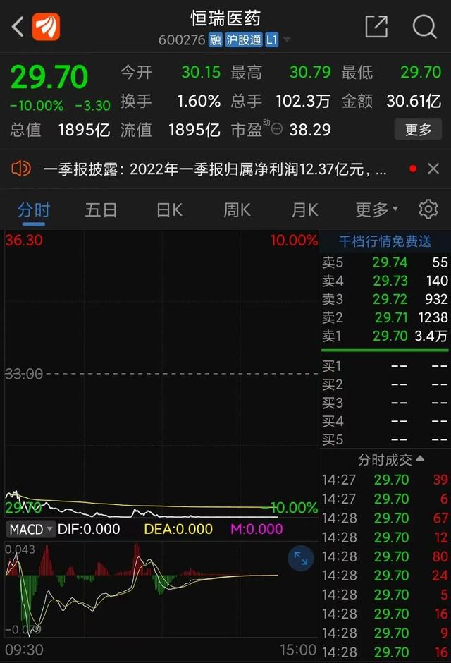 今天一开盘恒瑞医药股价就直接大幅低开,然后就一路直奔跌停板而去,最终被超过3万手的卖单封死跌停。上周五收盘的时候公司总市值还有2105.07亿,今天一个跌停直接跌破2000亿,最新市值1895亿!