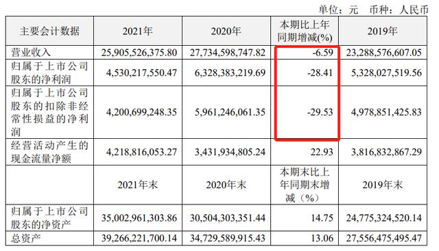 2021年报显示,公司全年营收259.06亿、同比下滑6.59%,实现归母净利润45.3亿、同比下滑28.41%,实现扣非净利润42.01亿、同比下滑29.53%,实现经营性现金流净额42.18亿、同比增长22.93%,归母净资产同比增长14.75%,公司总资产增长13.06%。