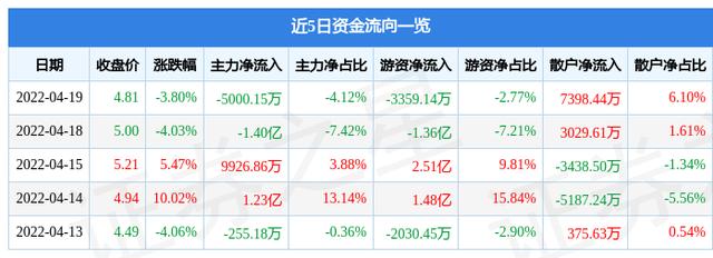资金流向数据方面,上个交易日主力资金净流出5000.15万元,游资资金净流出3359.14万元,散户资金净流入7398.44万元。近5日资金流向一览见下表: