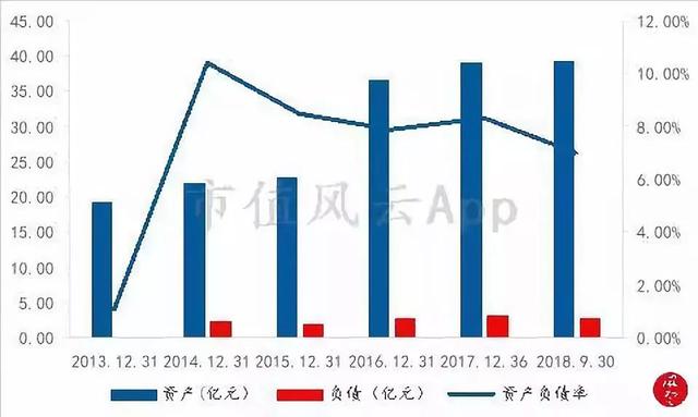 截至2018年9月30日,公司总资产为39.16亿元,总负债为2.73亿元,资产负债率6.97%;从负债结构看,在2.73亿元的负债中,占比最大的是1.24亿元的应付账款,在有息负债中,仅有3,510.00万元长期借款。