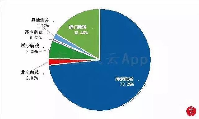 2017年度,公司营收9.78亿元,海安航线占营收的73.28%,港口服务16.46%,西沙航线5.85%,北海航线2.03%,其他航线0.61%,其他业务1.77%。