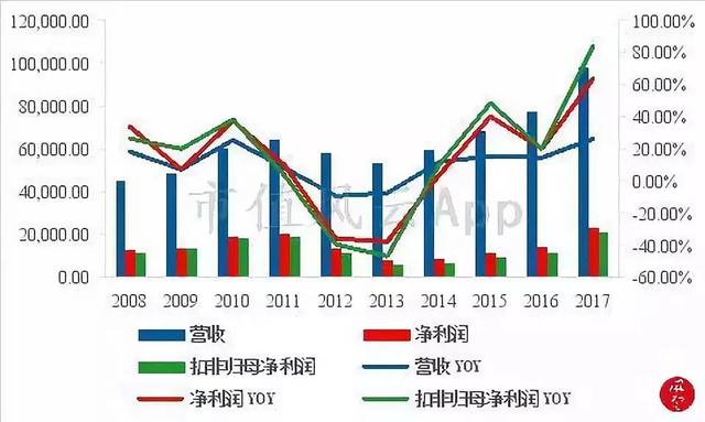 10年营收年均复合增长率8.98%,净利润年均复合增长率6.56%,这样的成长速度并不太出众。