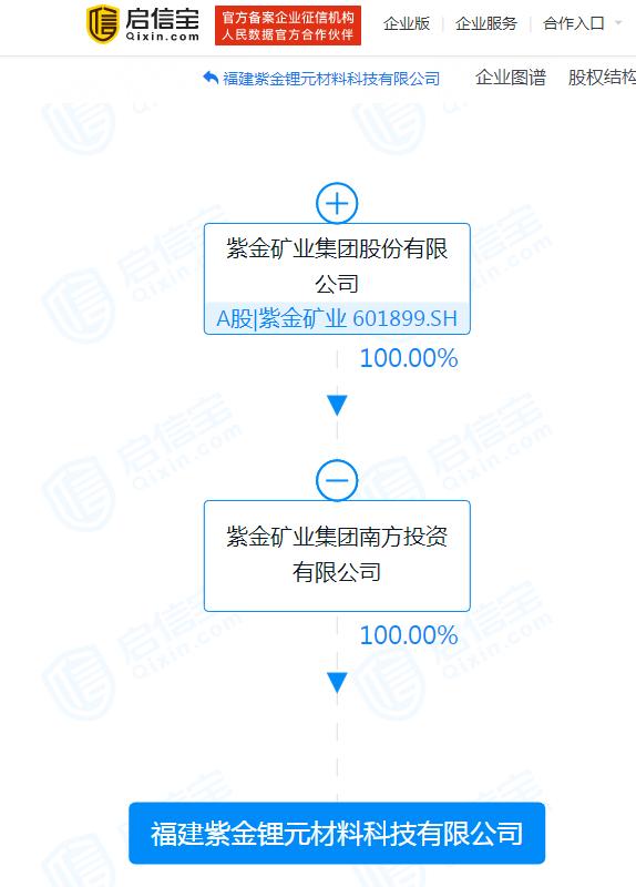 紫金锂元大有来头。启信宝显示,紫金锂元成立于2021年11月,现注册资本为3亿元,由紫金矿业南方投资全资持股。紫金矿业南方投资为A股上市公司紫金矿业的全资子公司。