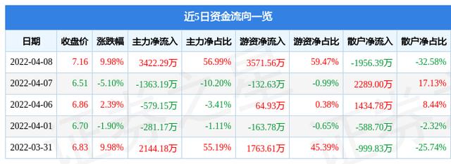 资金流向数据方面,当日主力资金净流入3422.29万元,游资资金净流入3571.56万元,散户资金净流出1956.39万元。近5日资金流向一览见下表: