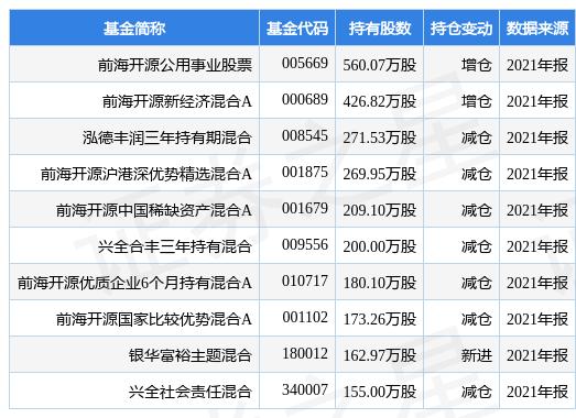 根据2021年报基金重仓股数据,重仓该股的基金共494家,其中持有数量最多的基金为前海开源公用事业股票。前海开源公用事业股票目前规模为258.16亿元,最新净值2.963(3月22日),较上一日上涨0.86%,近一年上涨99.14%。该基金现任基金经理为崔宸龙。崔宸龙在任的公募基金包括:前海开源沪港深非周期股票A,管理时间为2020年7月20日至今,期间收益率为-21.67%;前海开源新经济混合A,管理时间为2020年10月27日至今,期间收益率为100.87%;前海开源沪港深智慧生活混合,管理时间为2021年6月24日至今,期间收益率为-29.33%。