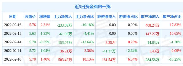 资金流向数据方面,上个交易日主力资金净流出233.09万元,游资资金净流入0.0万元,散户资金净流入408.24万元。近5日资金流向一览见下表: