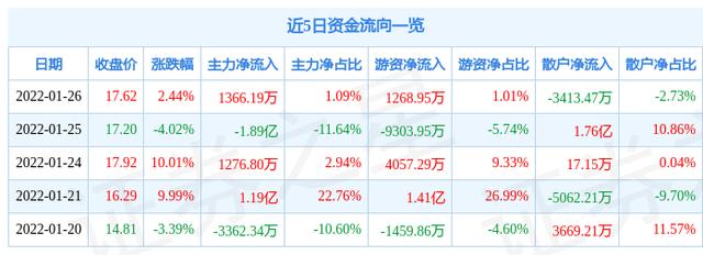 资金流向数据方面,上个交易日主力资金净流入1366.19万元,游资资金净流入1268.95万元,散户资金净流出3413.47万元。近5日资金流向一览见下表: