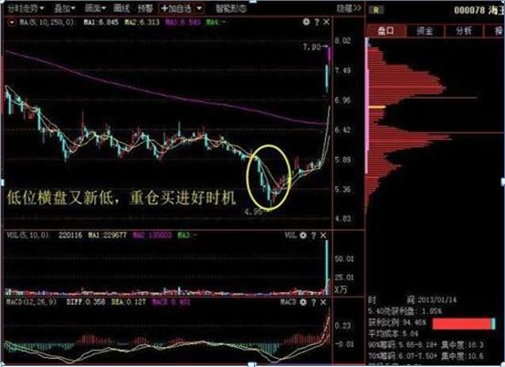 口诀四:高位横盘再冲高,抓住时机赶紧抛;低位横盘又新低,重买进好时机。