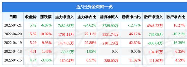 资金流向数据方面,上个交易日主力资金净流出7482.68万元,游资资金净流出3789.9万元,散户资金净流入4946.22万元。近5日资金流向一览见下表: