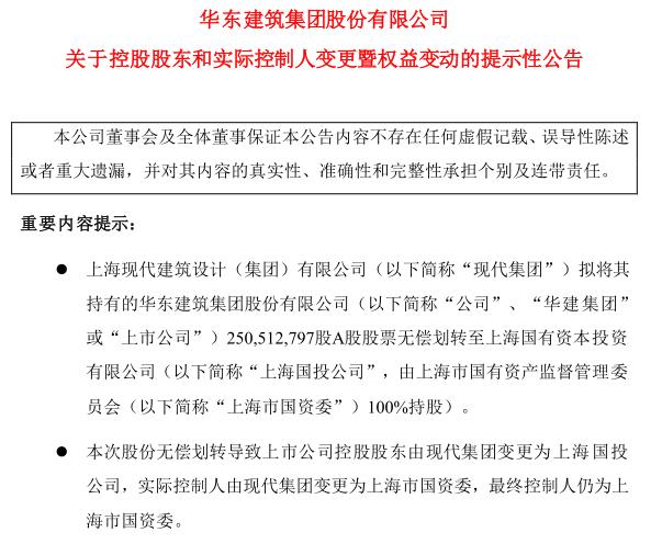本次无偿划转的实施将导致华建集团直接控股股东由现代集团变更为上海国投公司,实际控制人由现代集团变更为上海市国资委,最终控制人仍为上海市国资委。