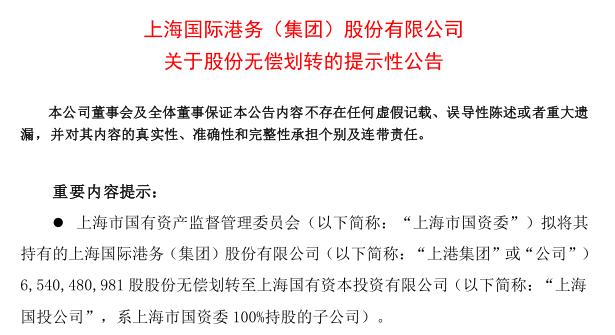据上港集团披露,上海市国资委(划出方)与上海国投公司(划入方)于2021年11月15日签署《国有股份无偿划转协议》:上海国资委拟将其持有的上港集团65.4亿股股份(占公司总股本的28.10%)无偿划转至上海国投公司。双方还确认,本次无偿划转仅涉及上港集团部分股份划转,不涉及职工安置问题。